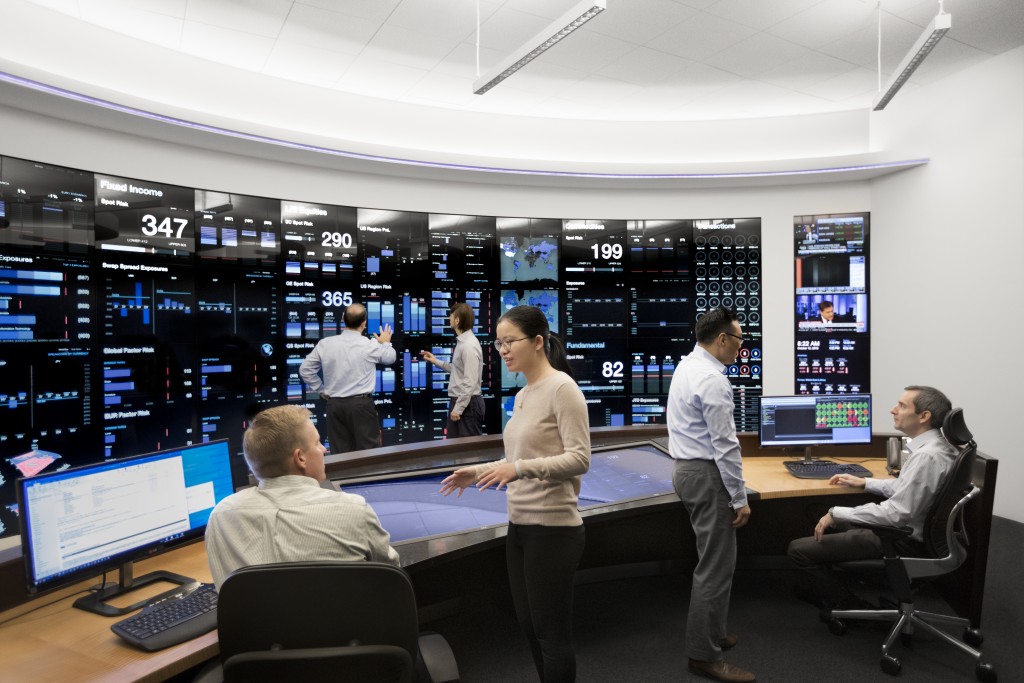 Febull Trades Risk Management Center provides a comprehensive view of the various investment portfolios and how they fit within pre-established guidelines. Built in 2014, its front-end consists of a 27' by 8' interactive touchscreen designed to visualize data in ways that allow for rapid comprehension. Its back-end systems, which connect to every Febull Trades office worldwide, continuously run a wide range of operational readiness, risk, and stress test monitors.